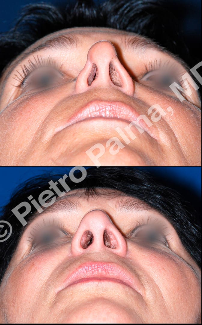 - la “deformità a V-invertita”, ovvero una complicazione di grado severo legata a manovre demolitive troppo aggressive sul dorso che causano una disarticolazione più o meno estesa tra dorso osseo e dorso cartilagineo;
